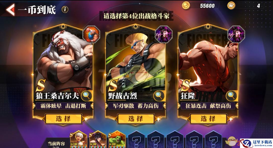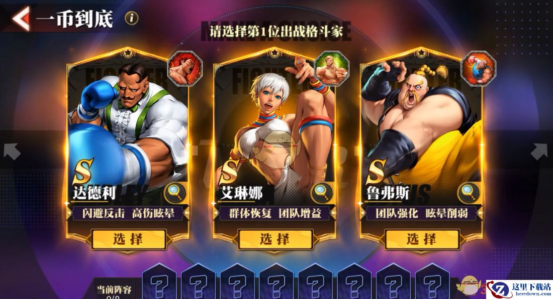 在一币到底玩法里,色选择机制是随机出现的,且是三选一。因此想要硬凑-队阵容难度比较高,所以可以提前在心中想几套预选方案,选人时尽往几仿案上靠。实在没理想方案再考虑用当前选的格斗家进行混搭。既然有方案就会有选人核心,例如以达尔西姆为核心的火队,后若没有成套阵容,则可以选一些火队能连招的格斗家, 也是不错的阵容选择。