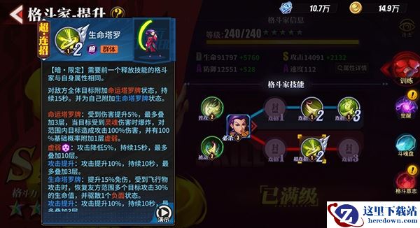 这套配置里罗斯和蛛俐是核心输出,罗斯是一个攻防兼备的格斗家,生命塔罗牌提升队友属性,命运塔罗牌会对目标造成高额伤害。比如被动灵魂占卜,就能让己方格斗家释放技能获取攻击、防御等属性加成。像连招2、3和超连2,除了对目标造成伤害,还会有各种负面状态,降低敌方的输出能力。
