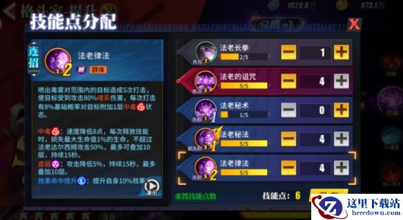 加点分析:超连招是法老达尔西姆的主要输出技能,不俗的AOE持续伤害,加上会给敌人附加中毒状态的效果,在战局中往往能给与对手致命的打击!被动和连招2,都可以将法老达尔西姆的毒伤发挥到极致,建议副加。