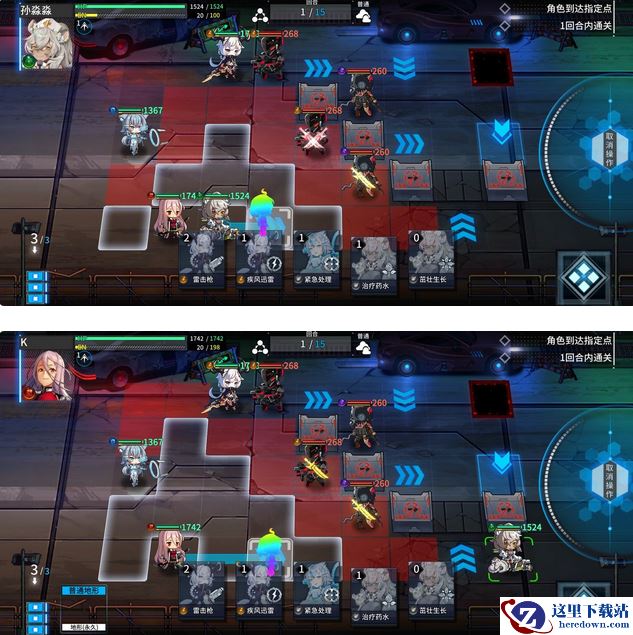 站位就是这样,上面两个下面两个(是谁都无所谓),只需要下面的依次踩加速带,上面一个人(我的是珞珈)打死一个怪后再次行动踩加速带就通关了!
