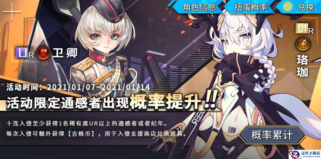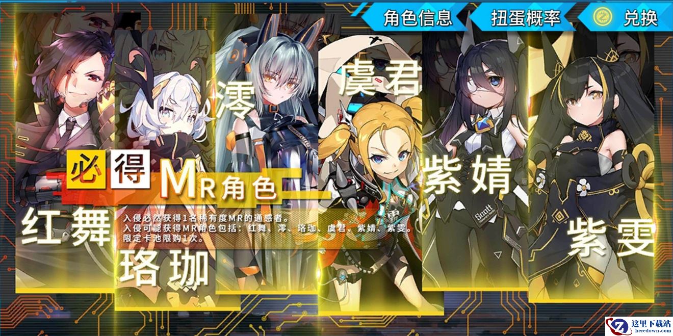 卡池开放期间,抽取必定获得1名最高稀有度MR角色,包括『红舞』、『澪』、『珞珈』、『虞君』、『紫婧』、『紫雯』。