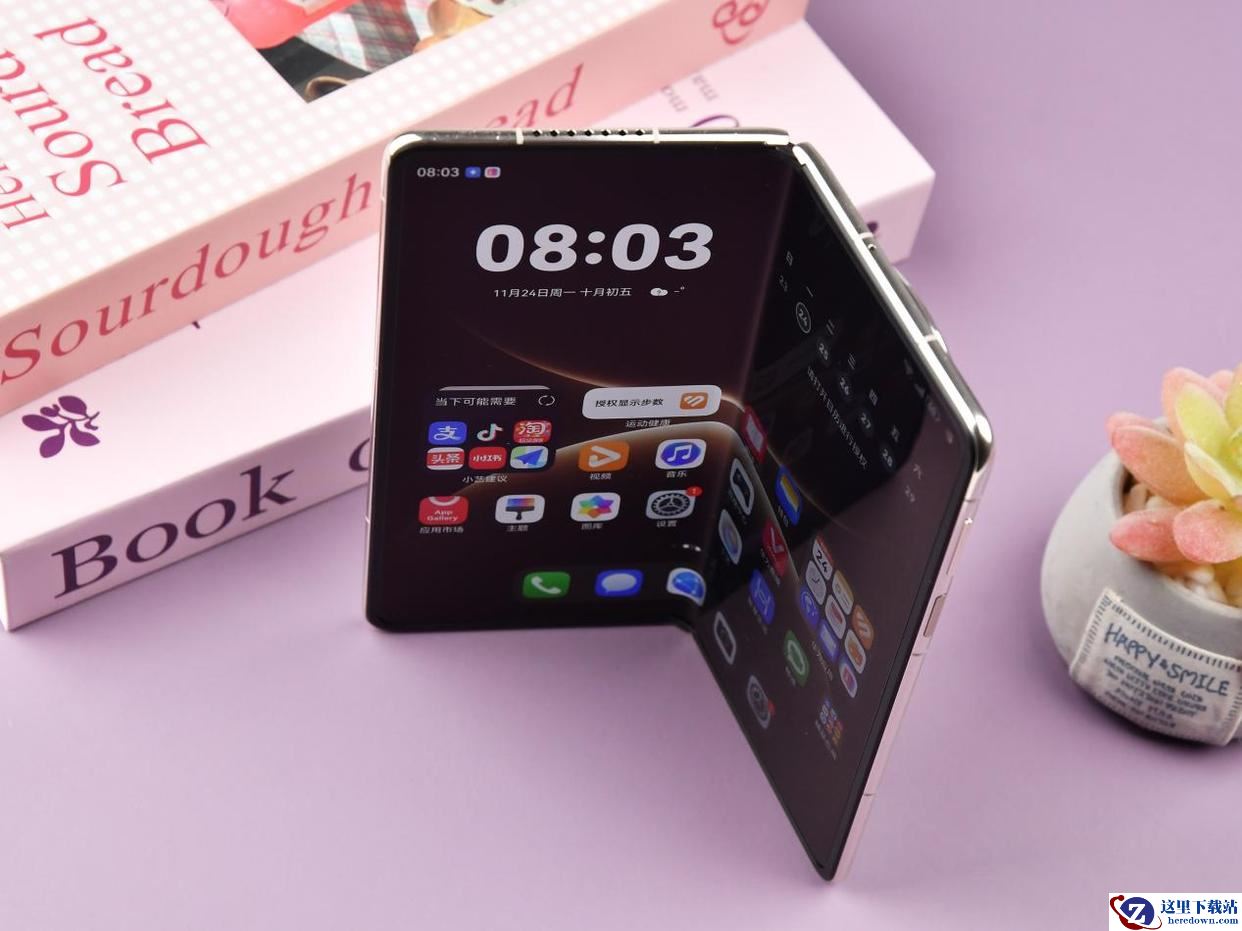 华为 Mate X7还是熟悉的内折设计。折叠状态下,它就是一部略微“瘦长”的直板机,单手握持外屏时,拇指可以轻松够到大部分区域。展开之后,机身厚度大概只有4.5mm,平放在桌面上时会有一种真正“平板化”的轻薄感。沿着中框滑一圈,可以感受到金属边框的过渡做得比较圆润,边缘都做了细腻的打磨,手指在上面来回滑动不会有割手的情况。