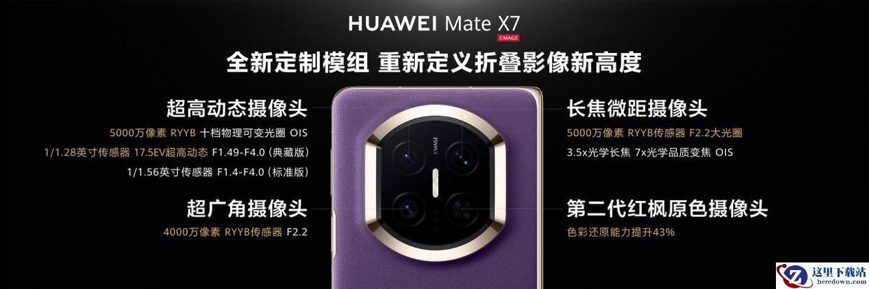 影像部分则是华为 Mate X7 本次加强的一大重点。它搭载了第二代红枫影像系统,主摄是一颗5000万像素的RYYB传感器,拥有1/1.28英寸的感光面积和十档物理可变光圈;长焦同样是5000万像素RYYB,支持3.5倍光学变焦,配备OIS光学防抖;超广角则是4000万像素RYYB。由于时间关系,更多的配置分析和样张解析我们就放到之后的深度评测来展开了。