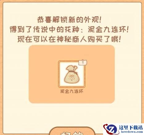 3、买完外观之后,就会收到一条信息:恭喜解锁新的外观!得到了传说中的花种,泥金九连环,现在可以在神秘商人购买了哦!这样,我们就解锁了一个神秘商人花种。