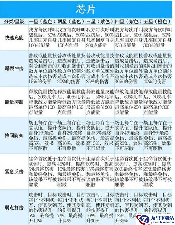 1、芯片一共有六种,快速充能,爆裂冲击,能量抑制,协同防御,紧急反击,弱点打击,套装技能星级以芯片最低星级为准,每个部队可以安装四个芯片,每个芯片有固定的位置,合成的时候千万别合错位置;