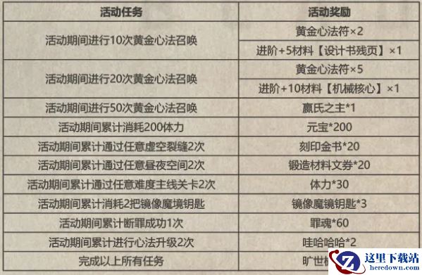 活动期间,通过完成以下任务即可在限时活动中免费领取稀有奖励,最高可获得“旷世械神”心法1张。