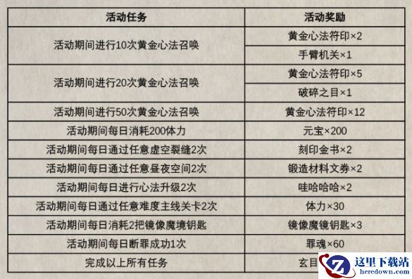 活动期间,通过完成以下任务即可在限时活动中免费领取稀有奖励,最高可获得“玄目凝天”心法1张。