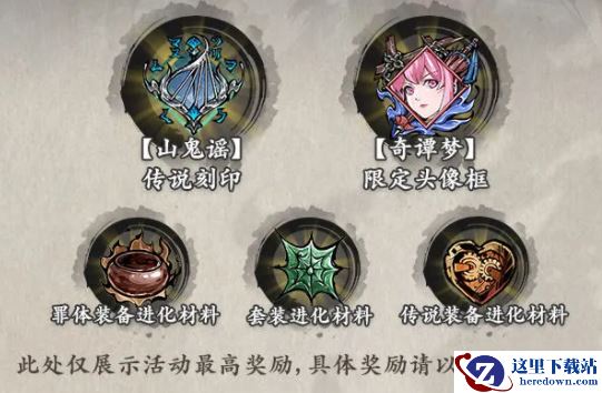 奇谭山共有7关,每天开放1关。关卡内大规模掉落全部类型的60级进阶材料(狂龙除外)和山鬼谣碎片[古谣乐灵]。可在八卦童子处消耗40枚[古谣乐灵]兑换1枚新传说刻印[山鬼谣] !
