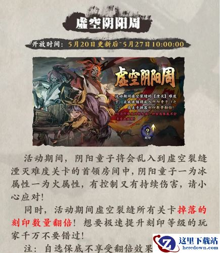 活动期间,阴阳童子将会乱入到虚空裂缝湮灭难度关卡的首领房间中,阴阳童子一为冰属性一为火属性,有控制又有持续伤害,请小心应对!
