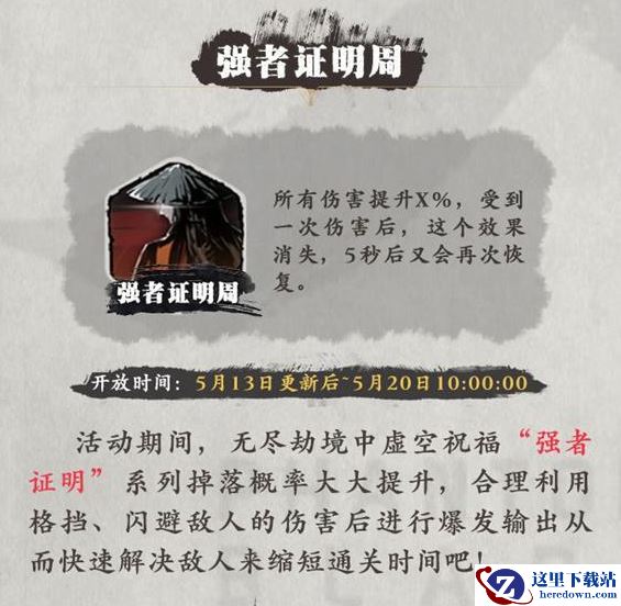 活动期间,无尽劫境中虚空祝福“强者证明”系列掉落概率大大提升,合理利用格挡、闪避敌人的伤害后进行爆发输出从而快速解决敌人来缩短通关时间吧!