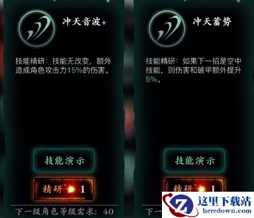 如图所示,在技能升级界面,部分技能会出现精研选项,选择合适的精研分支,可以用来应对变化莫测的挑战。