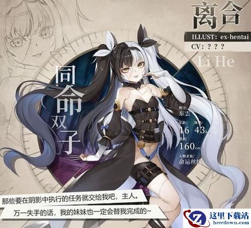 人物介绍:伽尔文帝国黑蜂特务机关“特殊”的一员。她们原本是出生于铃之国的一对相亲相爱的姐妹,姐姐顽皮冲动,生性好斗;妹妹沉默寡言,擅长医治。在一次突然降临的灾难中,姐妹两人身受重伤,生命危在旦夕。在此时刻,一位偶然路过的白衣术士将她们救起。她用特殊的医术将两人缝合,使她们的灵魂合二为一,并在白衣术士友人的安排下,被送往了伽尔文帝国进行修养。多年之后,少女被黑蜂特务机关所看中,以“离合”之名成为了机关中的一员,并在之后参与到了抵抗安息日的大军之中。