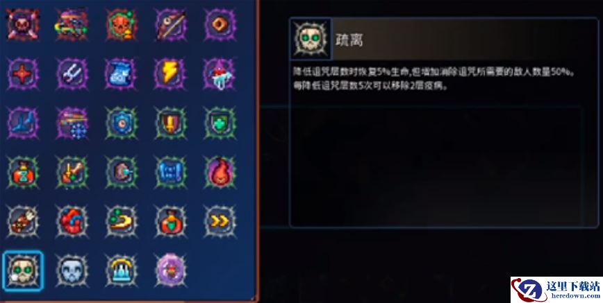 增加50%的诅咒层数,每消除一个诅咒,就会恢复5%的生命值,每降低5层变异会移除2层疫病。比如你强行开启宝箱,本来只会获得10层诅咒,但是在拥有疏离变异的情况下,会获得15层诅咒,也就是多一半诅咒层数。