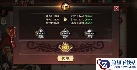 如图所示,武将突破需要消耗魂玉,突破后可解锁新的突破技能,每次突破可使自身攻、防、血 属性增加5%;