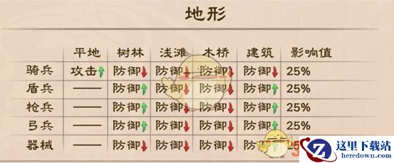 (3)浅滩,在浅滩里行军需要额外消耗1格行动力,受到水攻的伤害极高、士气-2,受到火攻的伤害降低,且不会起火