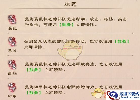 策魂三国中共有4中异常状态,分别为混乱、禁足、迷惑、碎甲