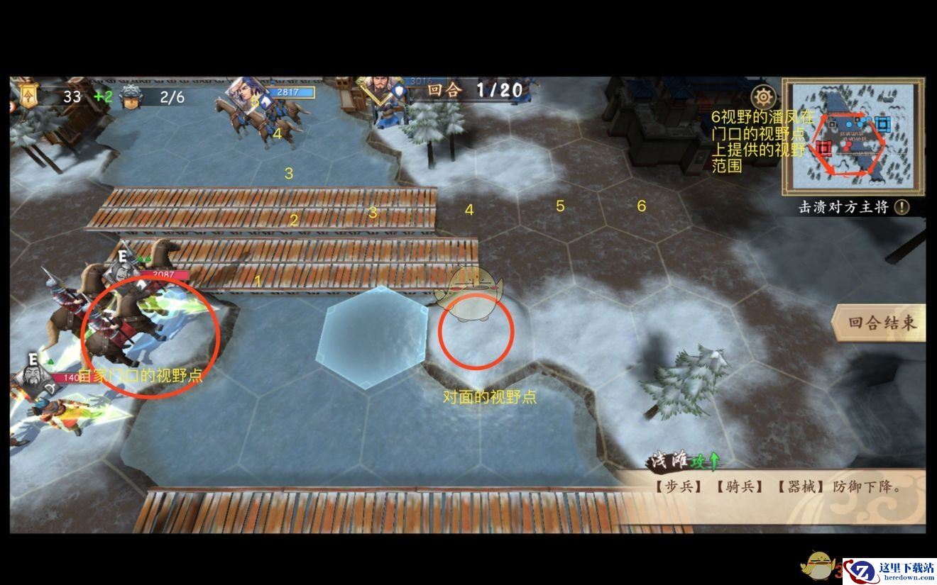 地图越小,视野越容易控制,如图所示,我使用的视野武将是潘凤,本身视野为3,装备为鹰+绝影,视野再+3,总视野为6,在两个基地的门口、木桥的旁边,都有一个1级高台,为本图先手的最佳视野点,后手需小心些,因为距离短,跑上去的视野兵可能第二回合就被集火死了。