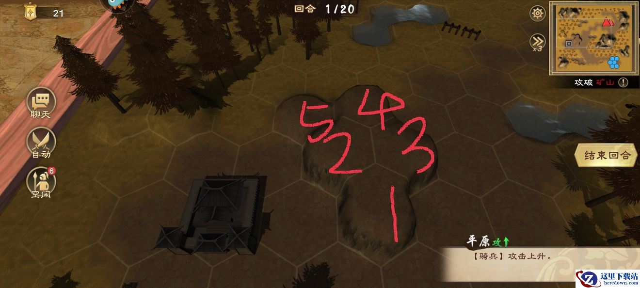 2.曹性紧跟糜芳身后,跟着糜芳节奏走,开局第一回合开奔袭,第二回合到矿4格外无限普攻。