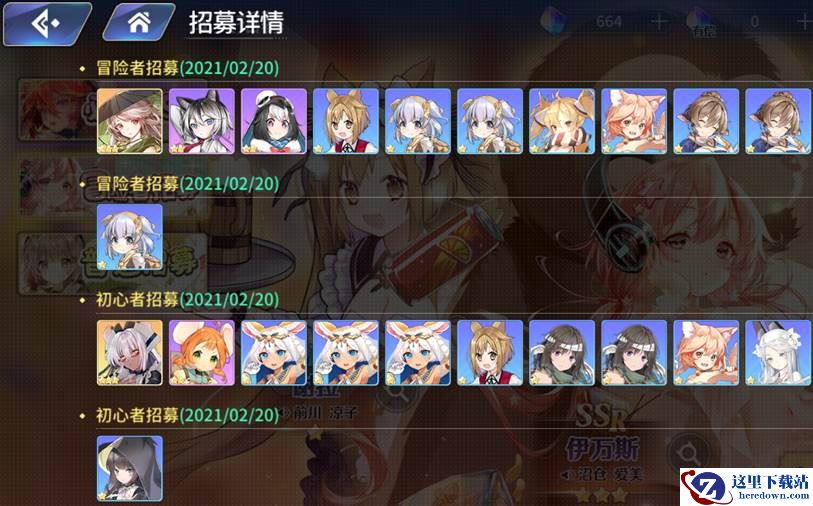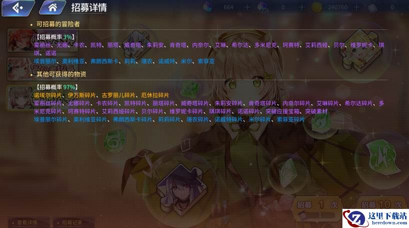 3、【冒险者招募】是正常的招募卡池,SSR的爆率为3%、SR概率为17%,建议大家十连抽这样必得SR以上的冒险者。