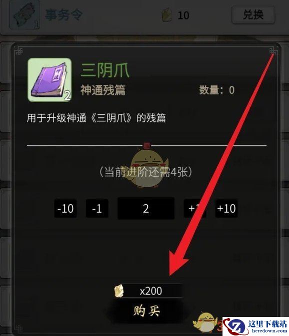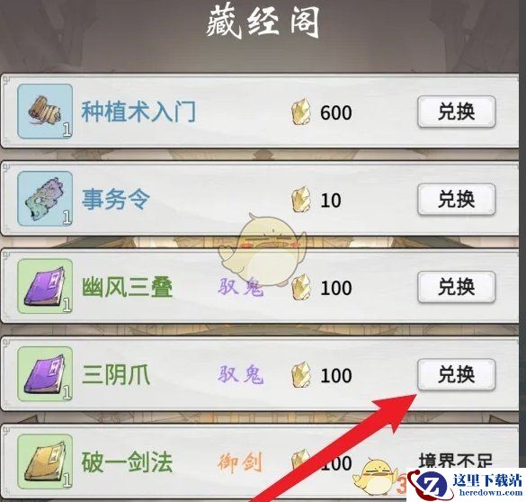 2、接着在藏经阁页面,找到三阴爪的神通残篇点击兑换;