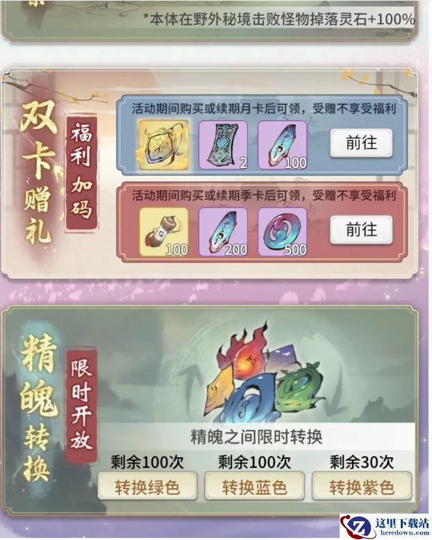 签到免费领古宝,灵石掉落翻倍、精魄转换限时开启。前往参与花海觅蝶、琼英祈愿,可获得造化玉等大量修炼资源。