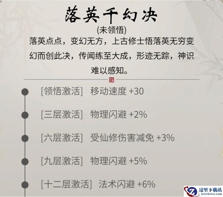 落英点点,变幻无方,上古修士悟落英无穷变幻而创此决,传闻练至大成,形迹无踪,神识难以感知。