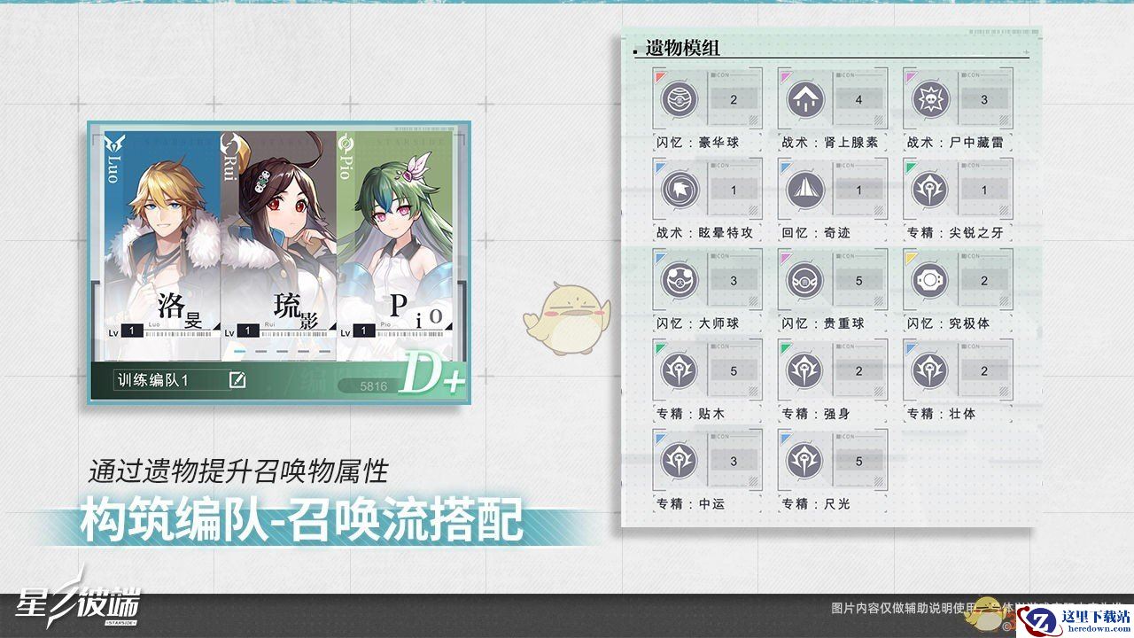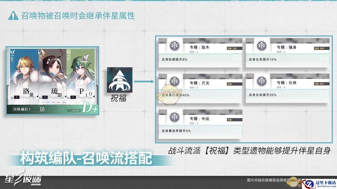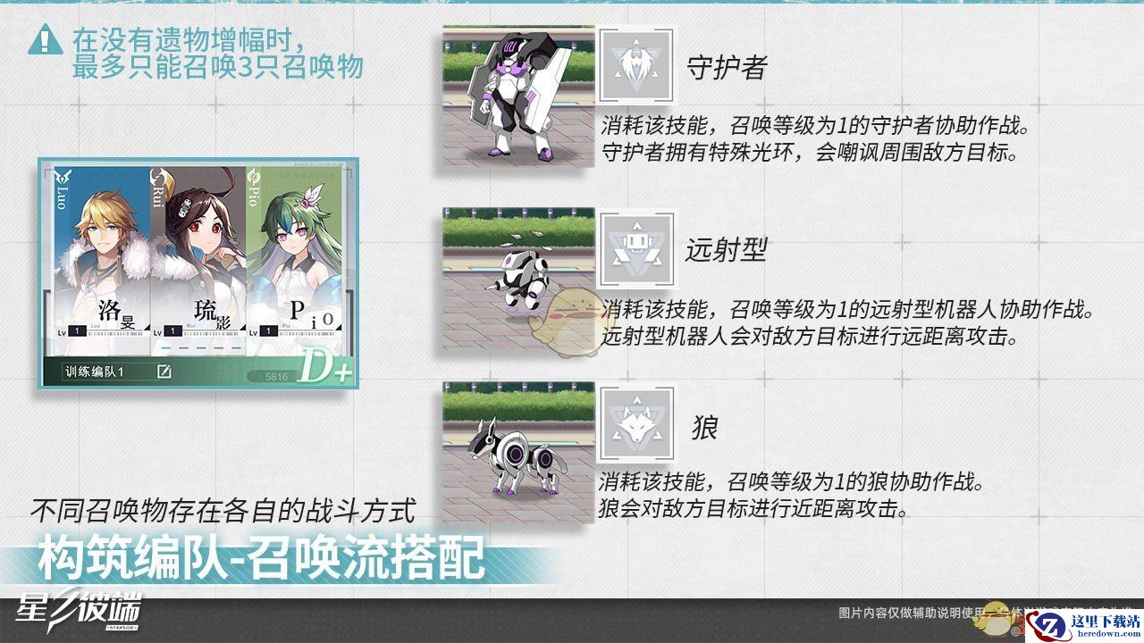 这里是一组拥有召唤类技能以及对应遗物的训练编队,该编队将通过召唤不同类型的召唤物辅助伴星作战,并且编队当中的遗物也会极大地提升召唤物的属性