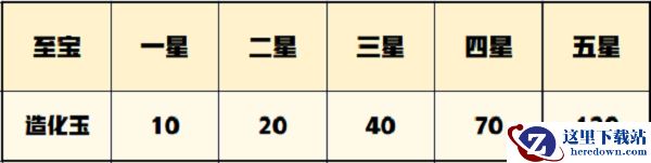 1、至宝最高可升至五星,每次升星所消耗的造化玉也是不同的,具体的升星消耗如下图所示: