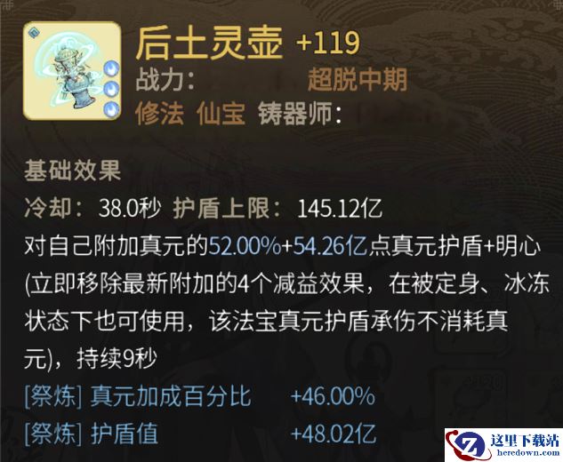 对自己附加真元的52.00%+ 54.26亿点真元护盾t明心(立即移除最新附加的4个减益效果,在被定身、冰冻状态下也可使用,该法宝真元护盾承伤不消耗真元),持续9秒