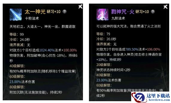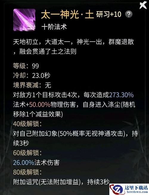 个人认为当前版本仙法必带的神通。戮神火致盲骗关键技能、太一沉默保盾都是仙法几乎必备的技能。太一自身倍率非常出色,可以轻松破千;戮神火作为主打功能性的神通,其20秒的cd足够弥补倍率上的不足。