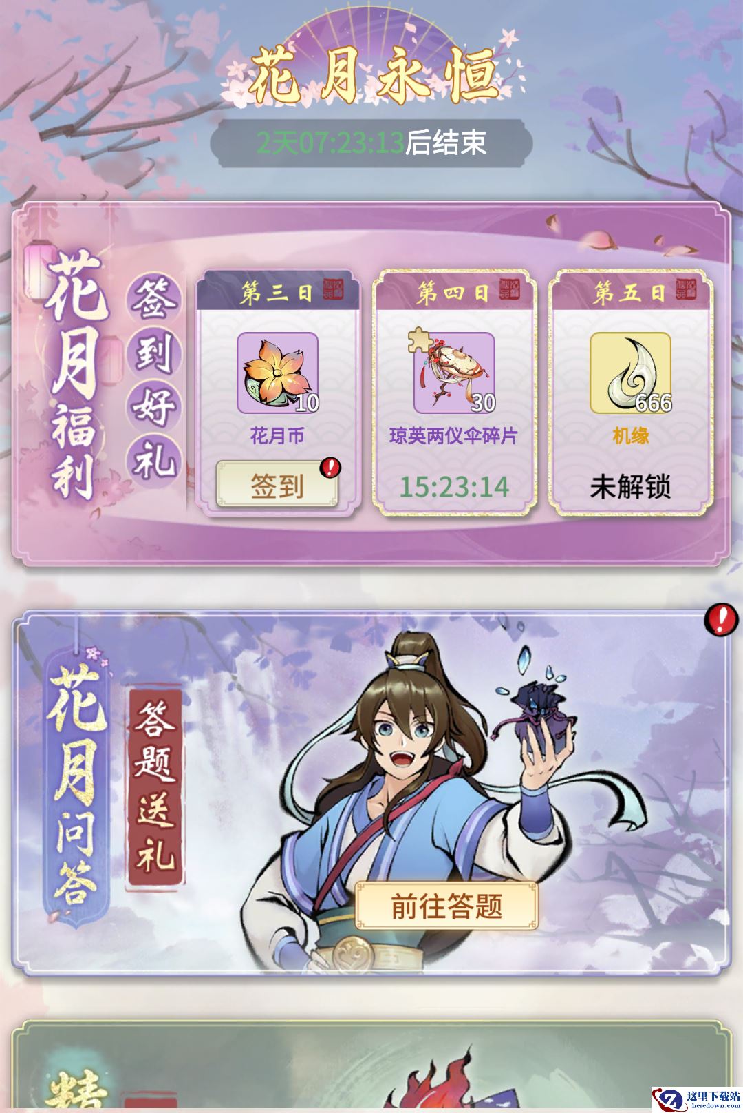 活动期间,每天签到可免费领取限定古宝等奖励。参与限时活动“花月问答”,每天答题即可获得奖励。