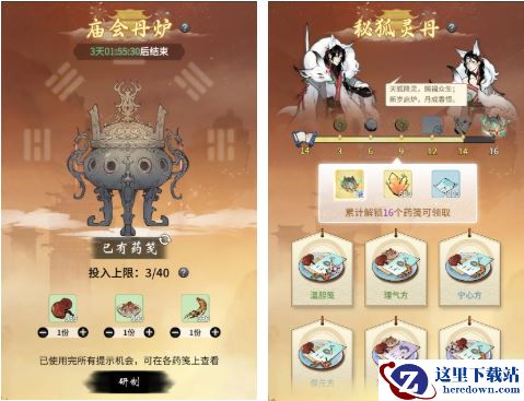 1、通过挂机获得三种不同的药材,再把三种不同的药材通过配比得到不同的药笺,每个药笺都有一个正确的配比,累计解锁药笺数量获得奖励!