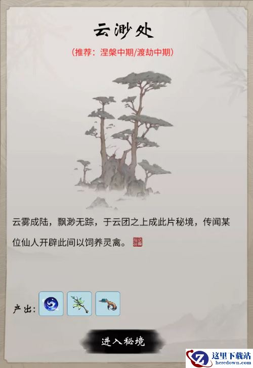 踏入此境,有如脚踏云雾,只需一瞬便飘渺无踪,相传某位仙人为豢养灵禽开辟此间,这里栖息着大量的玄鸟,会对靠近的修士展开攻击,建议涅槃/渡劫中期的修士前往狩猎
