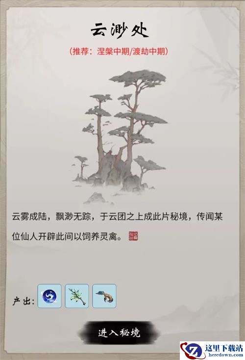 踏入此境,有如脚踏云雾只需一瞬便飘渺无踪。相传某位仙人为豢养灵禽开辟此间。这里栖息着大量的玄鸟,会对靠近的修士展开攻击,建议涅槃/渡劫中期的修士前往狩猎。