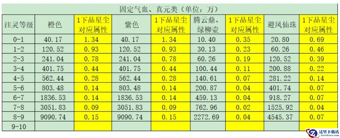 其中黄色标注区域:1下品星尘可以带来的属性即为性价比,数值越高,该等级的注灵优先级越高。