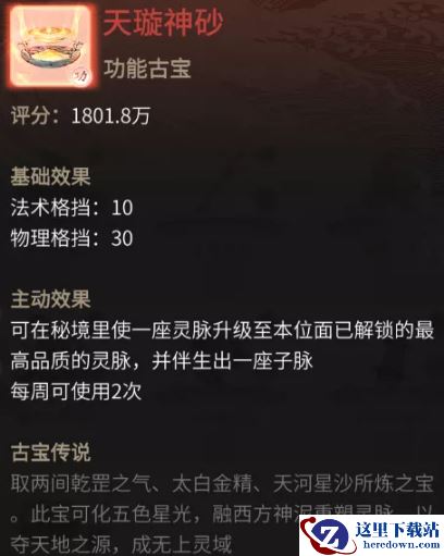 效果:可消耗一定数量的如梦令,夺天地灵气、聚灵成脉,将任一灵脉的品质提升至本位面已解锁的最高品质,同时伴生出一座子灵脉。子母灵脉只有使用该古宝的大能及其同宗门的仙友方可进行采集。