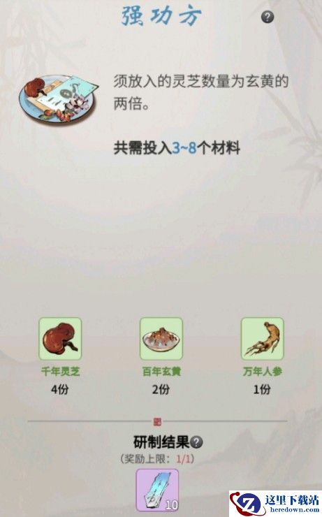 强功方药方:千年灵芝4,百年玄黄2,万年人参1