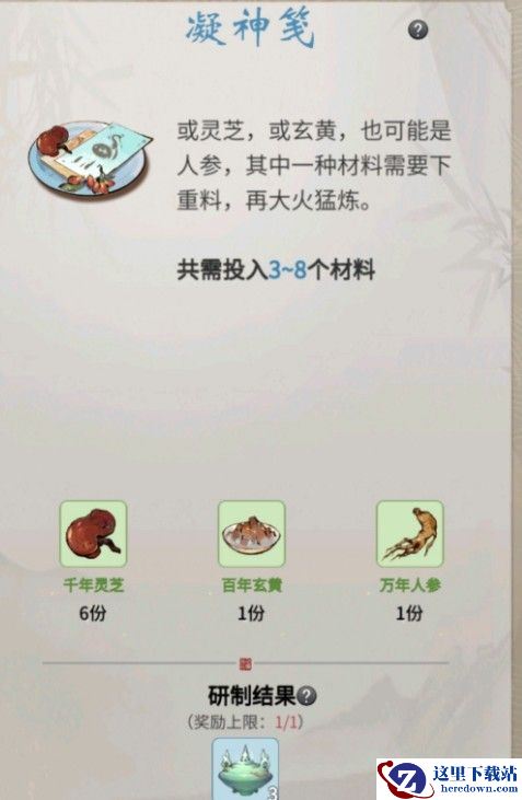 凝神笺药方:千年灵芝6,百年玄黄1,万年人参1