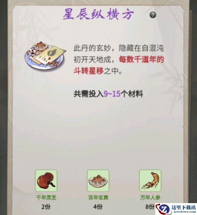 星辰纵横方药方:千年灵芝2,百年玄黄4,万年人参8