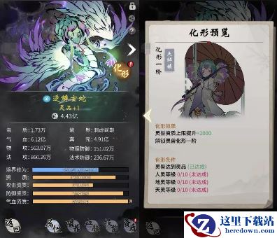 打开灵兽界面会发现有一个“化形”的小按钮,如果灵兽符合化形条件,那么就可以进行化形了,如果没有,也可以预览到灵兽化形的形态。