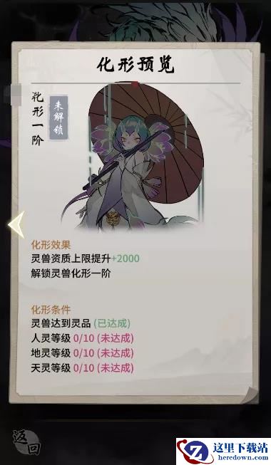 明天(4月9日)完成更新后,打开灵兽界面就会发现有一个“化形”的小按钮,如果灵兽符合化形条件,即可拥有化形机会,如果没有,也可以预览到灵兽化形的形态。