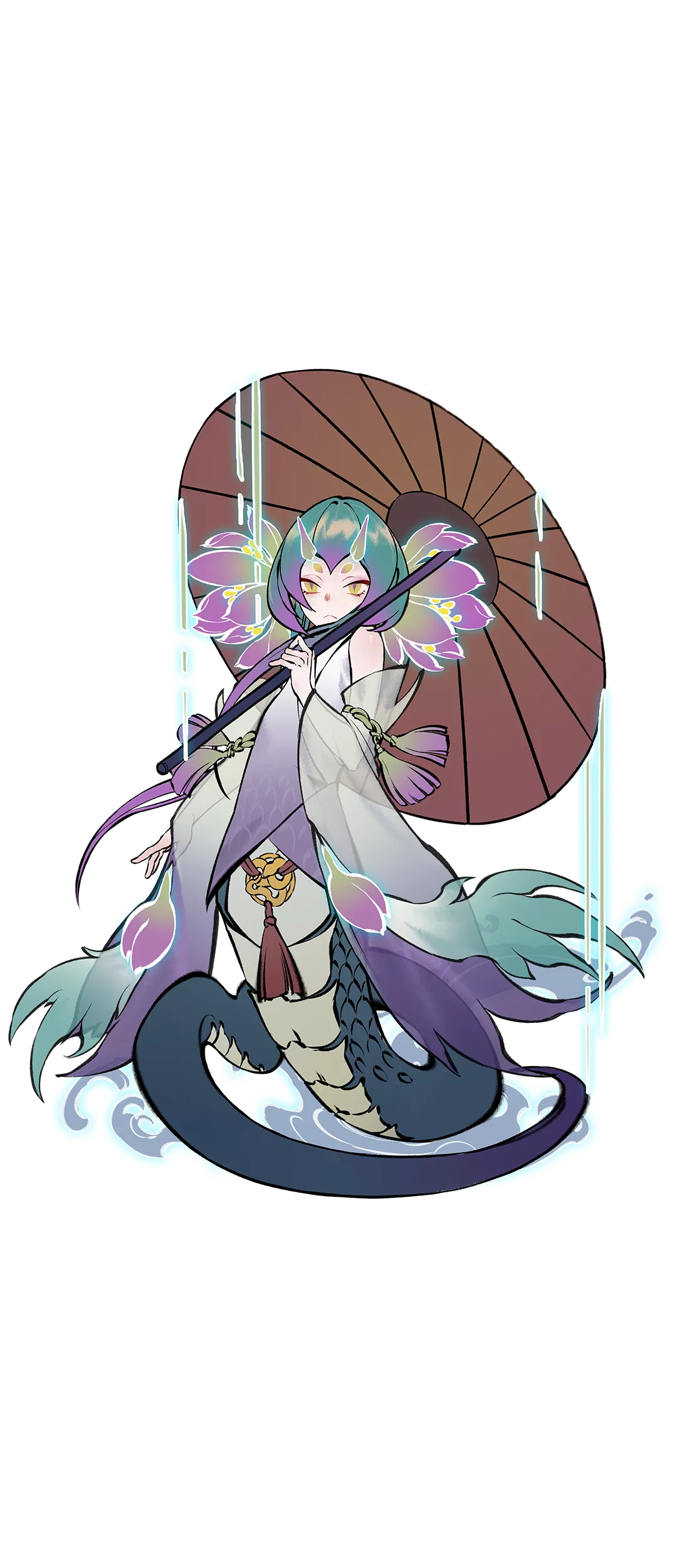 化形之后的逆鳞玄蛇,收起了她曾经引以为傲的双翼,将其化作两袖薄纱,宛如天仙下凡,不可方物。原先在她头顶才露尖尖角的花儿也早已怒放,昭示着她的再度新生与活力。撑起的油纸伞,是否是期待着在逍遥世界中,演绎属于她自己的《青蛇传》呢?