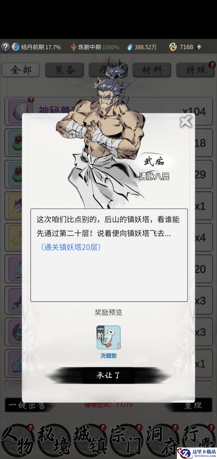 武痴是练武的旷世奇才,他热爱武术,苦练神通,也有着一定的修为。不同境界的武痴总是会同时出现在城镇中,点击城镇界面中“武痴”图标,方可知道该武痴的境界如何。