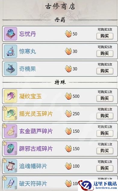 古修商店内的商品类型繁多,玩家们各取所需进行购买即可。