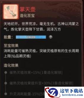 基础的能量消耗效果为:每消耗1点能量催熟灵植一小时。而1重造化后可以提升15%催熟速率,3重造化后可以提升30%催熟速率。
