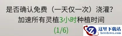 一天共有6次浇水机会,第一次是免费的,但是之后就需要小伙伴们使用机缘来购买浇水次数,每增加一次浇水次数机缘就会随之上涨,如果你种植的种子比较多,那么就要当心你的机缘够不够用来浇水了。
