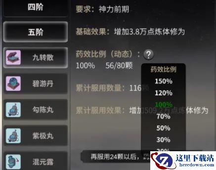 3、服用秘药,每天记得去天机阁和宝藏阁内的古修商店兑换秘药,注意秘药虽然每天没有服用上限,但随着使用同种秘药的数量增多,其增加修为的效果会下降。这里建议在自己当前阶段,至少要把100%比例之前的数量全部吃满,才不会浪费。
