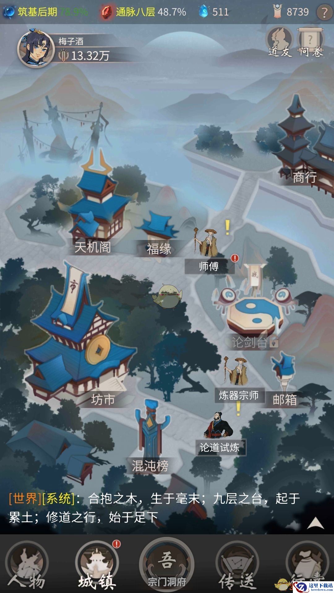 1、城镇界面头像:点击头像有声音和世界播报的设置头像的顶上分别为你法修修为进度、体修修为进度、灵石、机缘(灵石和机缘是游戏现在唯二的货币)。