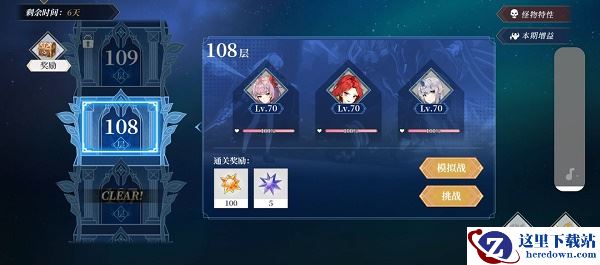 6、一众工具人(100层夏瓦尔):90层,100层的怪物伤害防御都很高,这时候就需要送两个工具人来触发爱缇欧的被动,保证伤害。