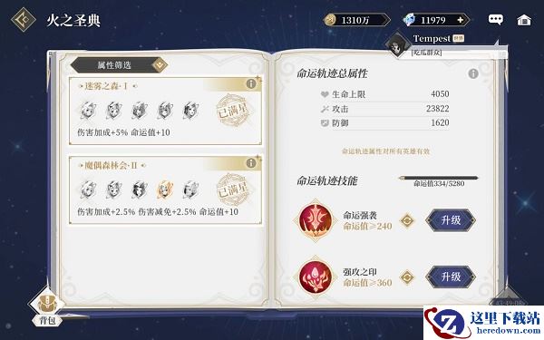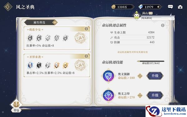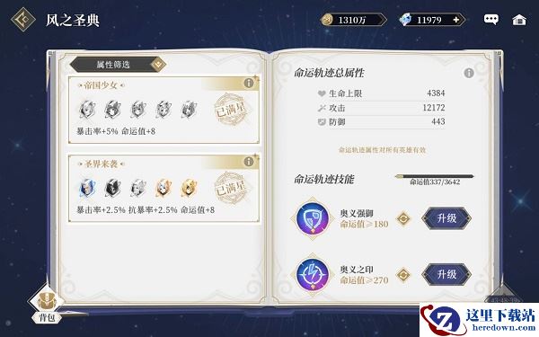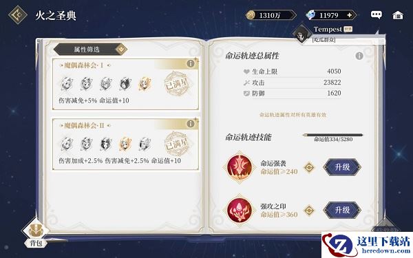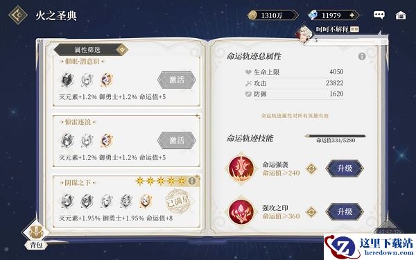 2、以上分别对应三个法典的高级属性,加的战力最多,提升最大,必须优先点,即伤加,减伤,命中,闪避,暴击与抗爆,点完后,从右边红色法典开始加起,筛选职业属性——御四灭四,提升战力值排第二位